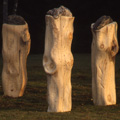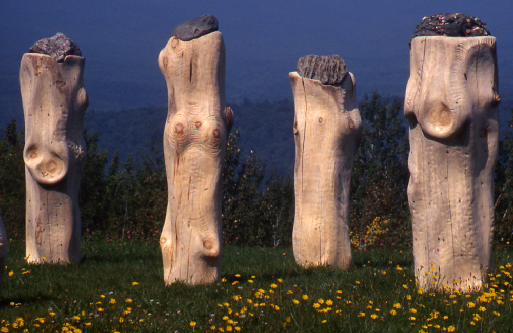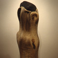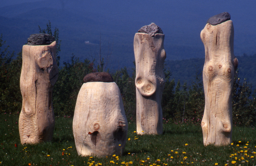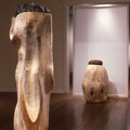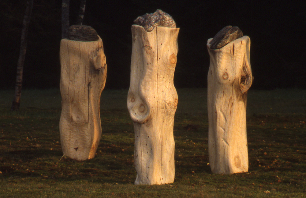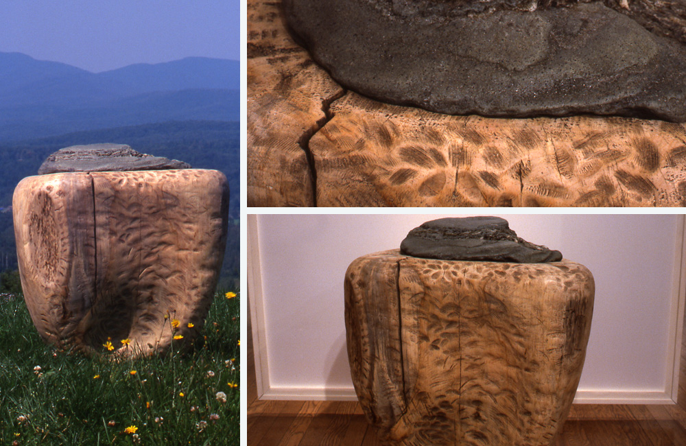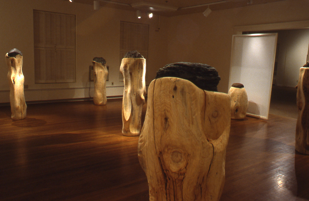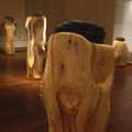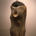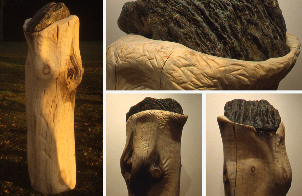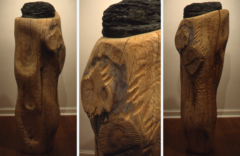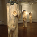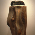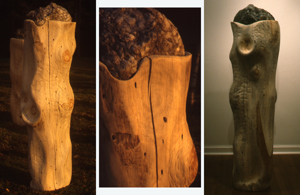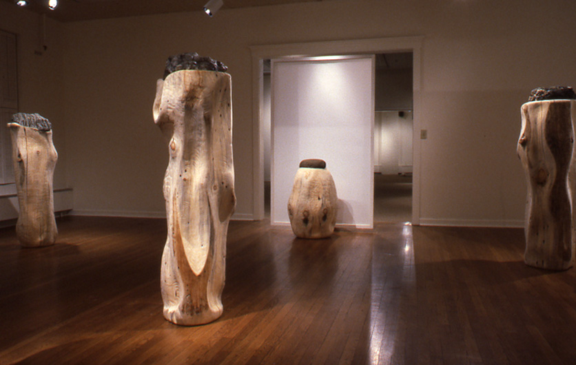 Large river stones full of shifting hues are inset into the top of totem like figures and appear to be simultaneously molded into and emerging out of the wood itself. Intriguing textures are intermixed with suggestive anatomical forms carved into the pieces, some male, some female, and in some instances both. I intentionally chose the totem form, imbued with all its spiritual overtones and rich with symbolism, as a vehicle to explore the concept of duality. A group of these sculptures assembled in a single exhibit hall creates a compelling atmosphere.